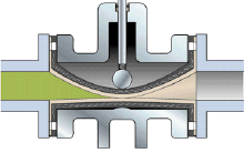 7、球形,指閥體外殼形狀。在采用用控制介質注入閥體外殼與套管之間,擠壓套管實現夾斷的方式時,采用球形外殼有利于套管在介質壓力下回到完全打開狀態。