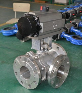 氣動三通球閥分L型和T型,介質流通方向見下圖。L型氣動三通球閥適用于介質流向的切換,能使相互垂直的兩個通道連通:T型氣動三通球閥適用于介質的分流、合流或流向 切換,T型孔道可以使三個通道互相連通或使其中兩個通道連通,氣動三通球閥一般采用三個閥座結構,亦可根據用戶要求采用四閥座結構。